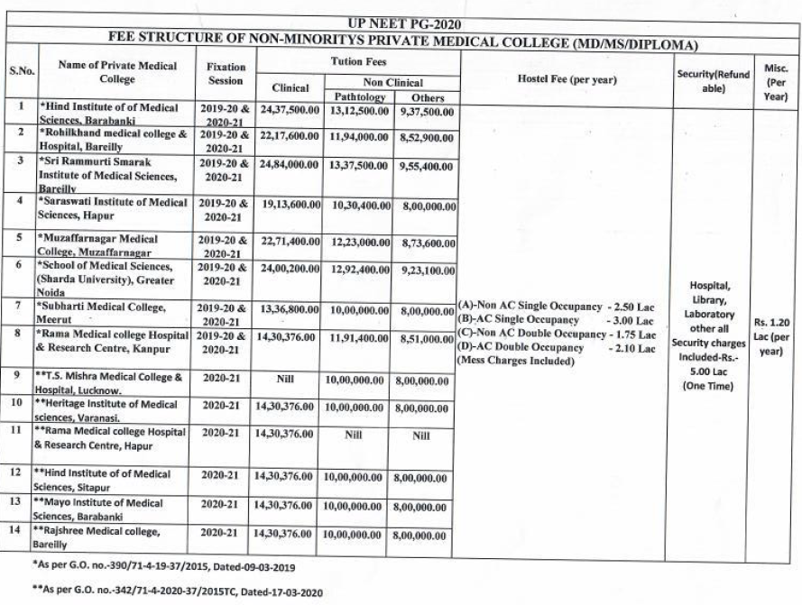 UP DGME has released the Fee Structure of Non-Minority Private Medical Colleges in Urttar Pradesh for NEET PG 2020. This feee is for MD/MS & Dilloma programs in Medical colleges in of UP.